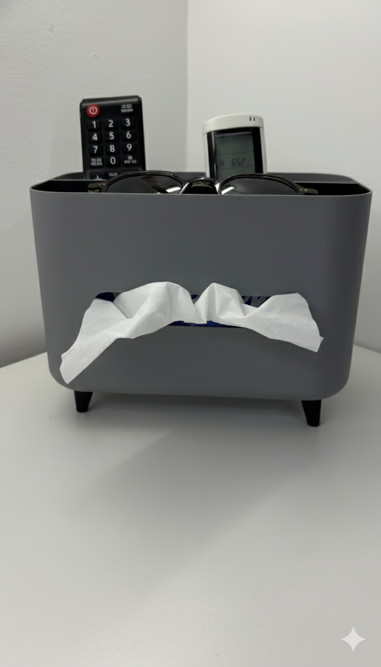 Keep your living room tidy with this thoughtfully engineered 3D-printed organizer. The modular design features a dedicated napkin compartment with removable cover, multiple slots for remotes and small essentials, and four sturdy support legs that elevate the piece for a refined aesthetic. Crafted from durable PLA filament, it combines minimalist styling with practical functionality—ideal for any interior.
