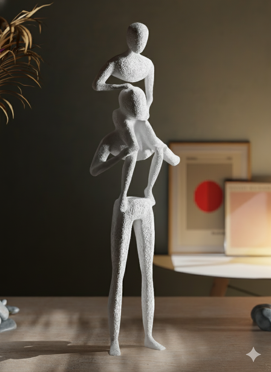 NObody Family is a single-piece sculpture celebrating connection and support, inspired by a personal photo of me riding on my father’s shoulders. The unified form features a stylized adult carrying a child, with a textured surface that makes a dynamic accent for shelves, desks, or mantelpieces.
